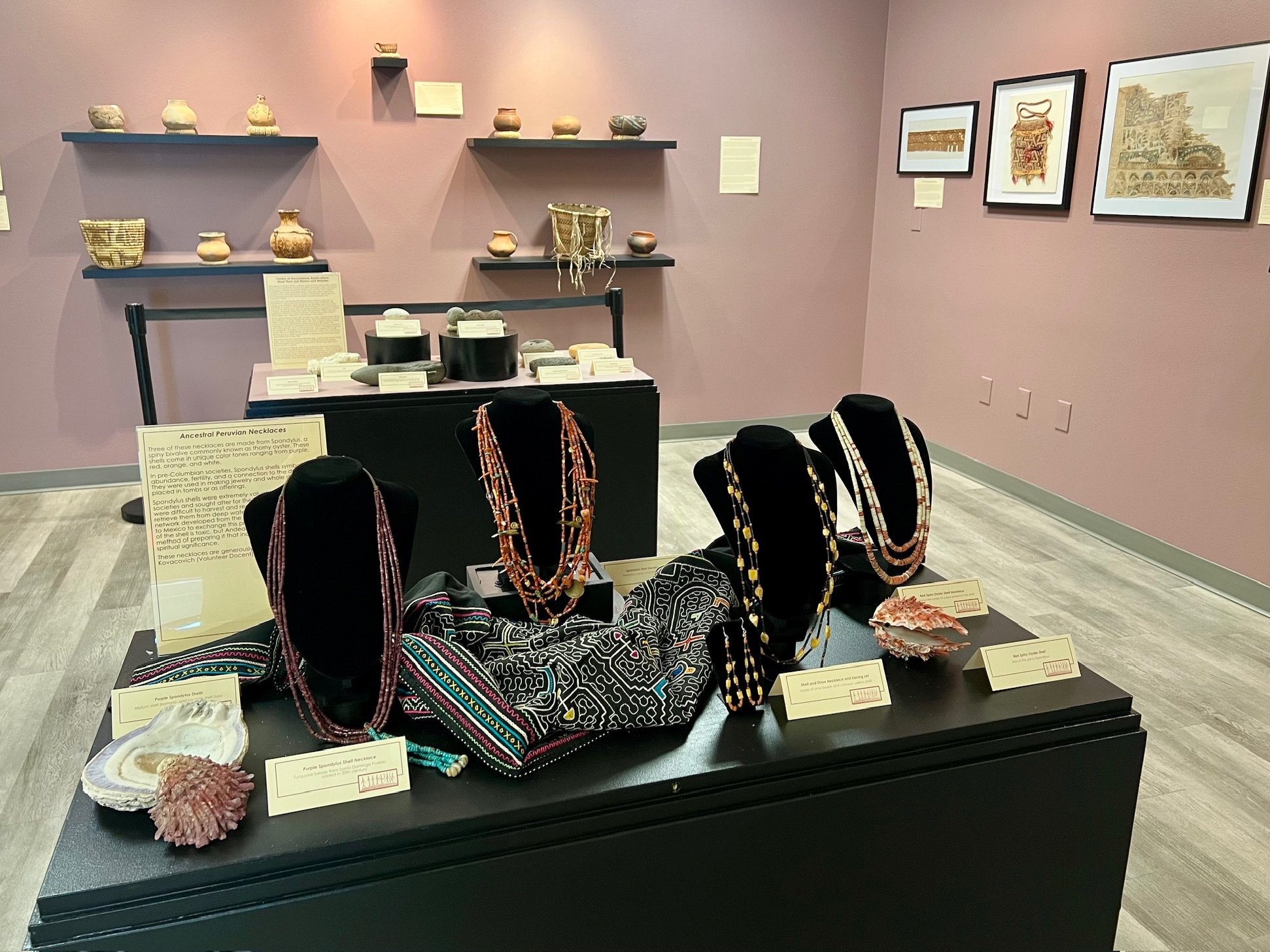 Lynette, an accomplished jeweler and silversmith, also acquired Peruvian necklaces that are on loan for the exhibit. These adornments are primarily made from Spondylus shell, which was extremely valuable in Andean societies and sought after for its vibrant colors. An extensive trade network developed from the coasts of Peru and Ecuador to Mexico to exchange this prized commodity.