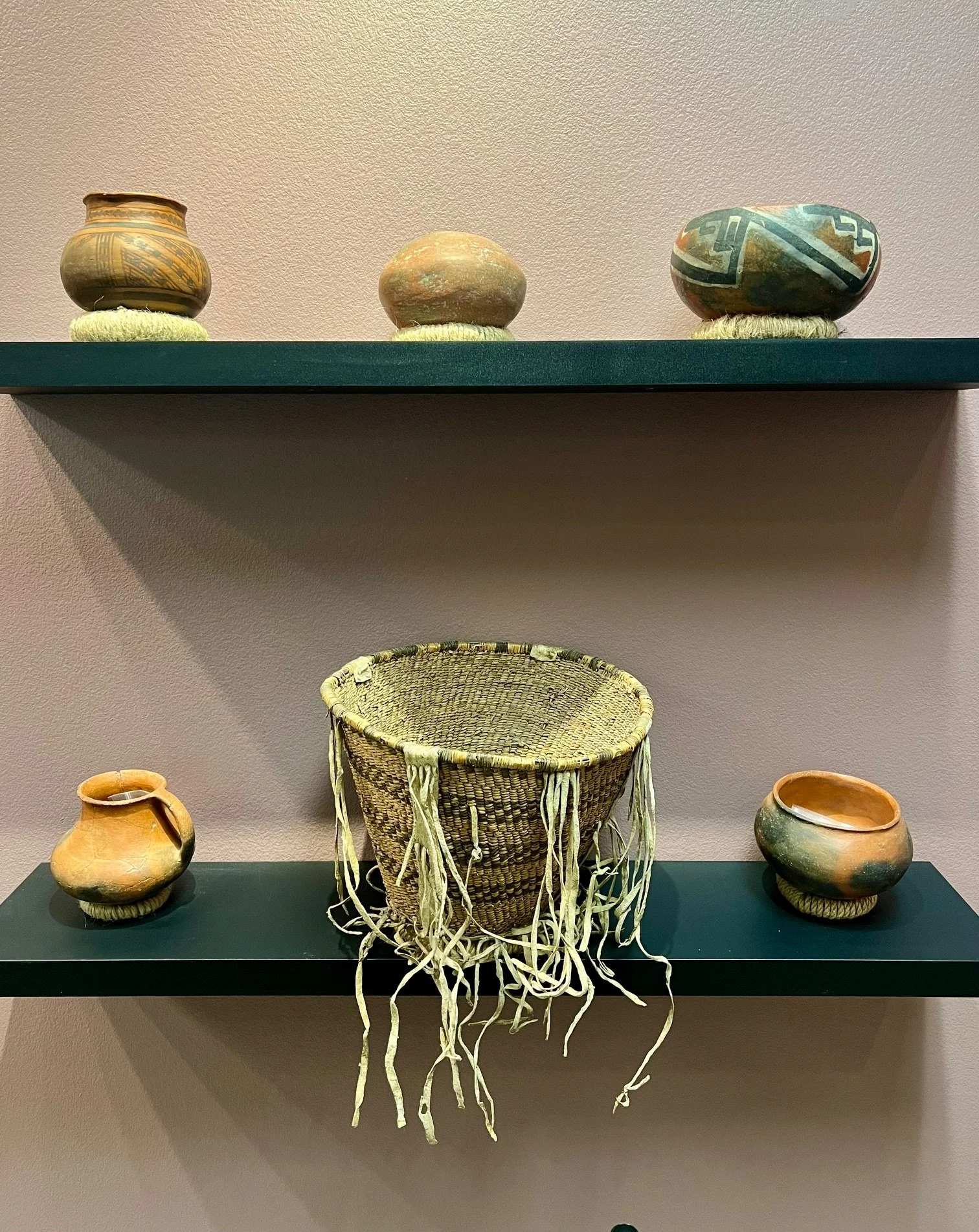 An assortment of baskets and pottery adorns the space’s back wall, highlighting the distinct pottery styles of different groups and the ceramic trade in the Southwest. One item resembling a teacup may be an example of Mojave pottery produced for the tourist trade in the late 19th to early 20th centuries. Although this “teacup” shape reflects European influences present in the region, Native American groups have long used herbal teas for medicinal and ceremonial purposes. Various Southwestern groups brew a medicinal tea from the ephedra plant, a woody shrub whose stems contain caffeine and ephedrine. Also known as Indian tea or Mormon tea, this remedy has been used to treat a variety of illnesses.